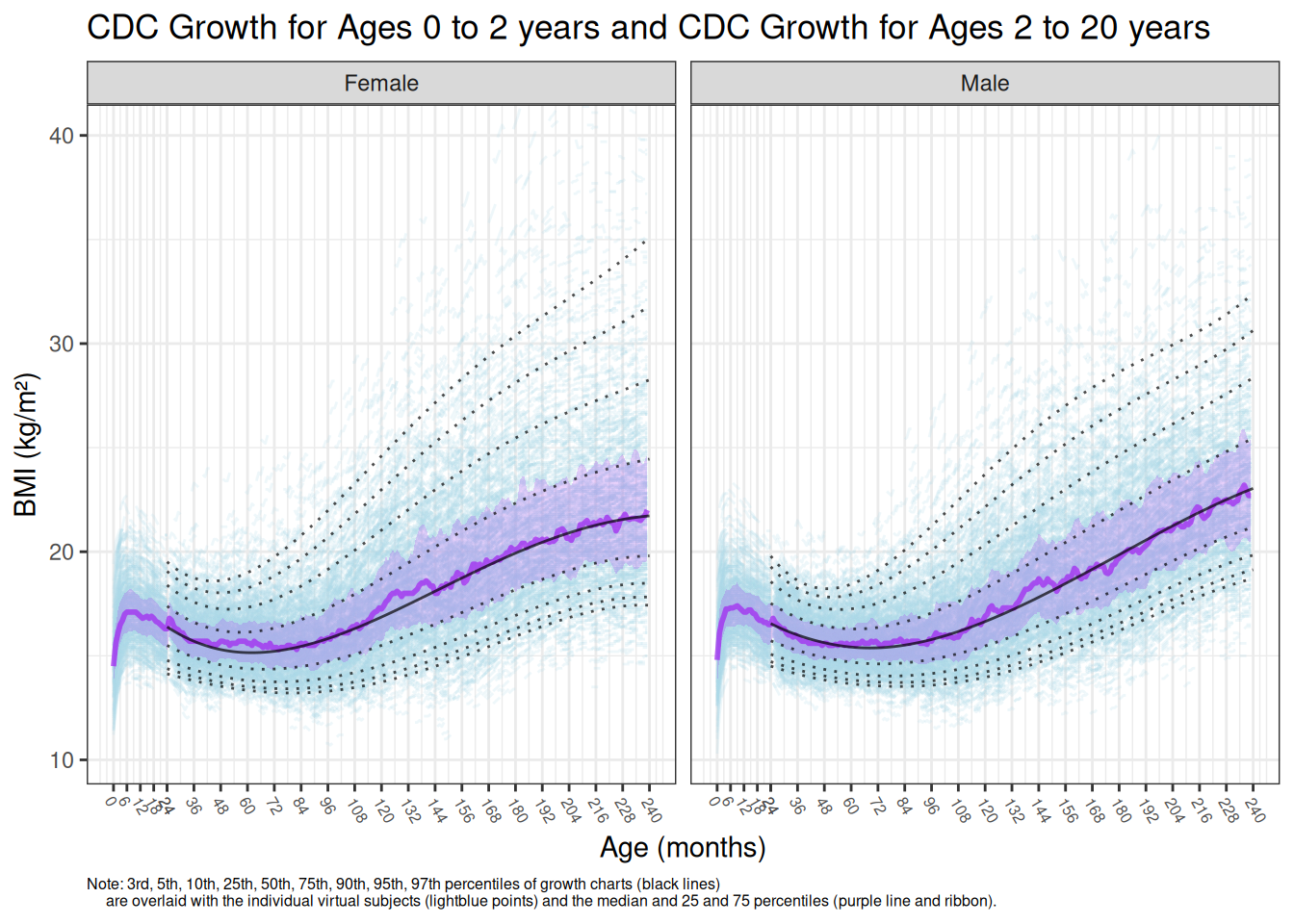 Finally, visually validate that the virtual population is reflective of the CDC growth chart data.